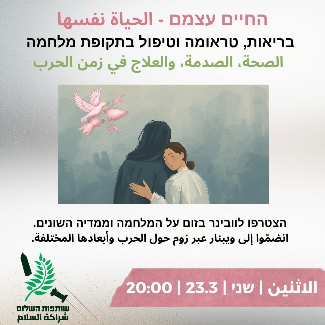 ندعوكم للتسجيل في ندوة حوارية تتناول موضوع الصحة، والصدمة، والعلاج في وقت الحرب، بتنظيم من “شراكة السلام” التي نشارك فيها كمنتدى.